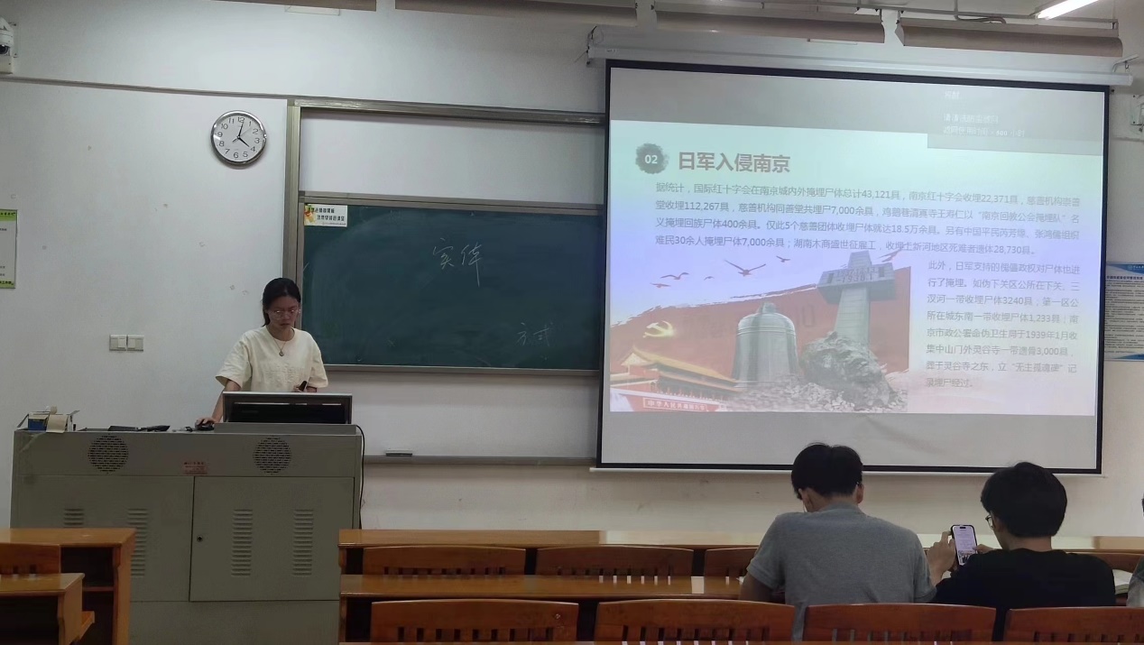 随后,刘萱简要介绍了南京大屠杀的历史背景和发生过程,并通过视频、图片和数据展示了侵华日军的血腥暴行。同学们回望悲惨历史,不禁陷入沉思,悲痛万分。