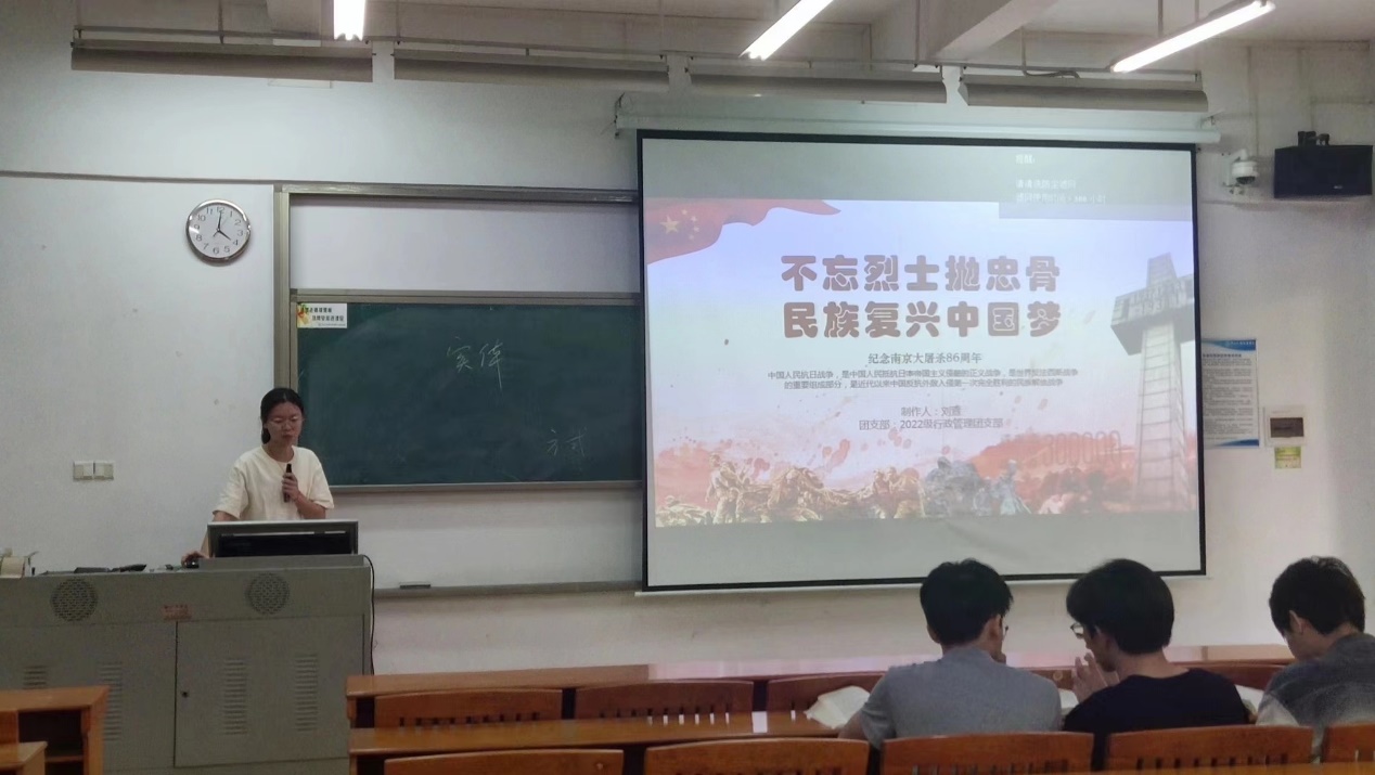 首先,团支书刘萱介绍了本次团日活动的主题,并以南京大屠杀的历史事件为主线,带领班级团员缅怀无辜的受难者,提醒同学们不能忘却历史,始终铭记民族复兴的中国梦。