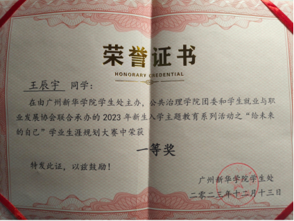 为了引导新生树立正确的世界观、人生观和价值观,帮助新生明确学习目标,规划好大学生涯,养成良好的学习和生活习惯,从根本上激发新生成长成才,全程导师组织新生参加学业生涯规划大赛。2023年23级行政管理王辰宇同学获得学业生涯规划大赛一等奖。