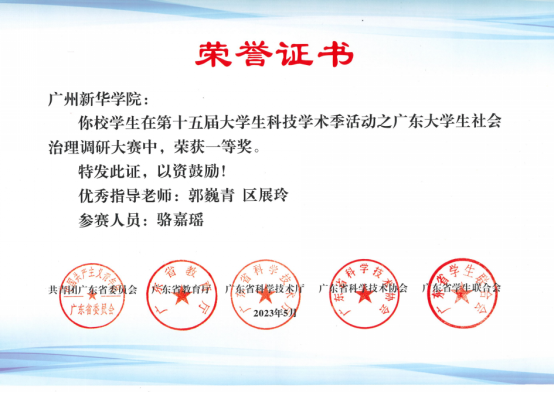 图15 行政管理学生获第十五届大学生科技学术季活动之广东大学生社会治理调研大赛一等奖