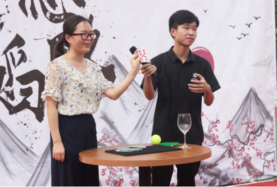 首先,我院学生会邀请了MK魔术社的周建明同学为我们带来了一个扑克牌魔术表演。他随机邀请到了刘玉漩老师作为他的魔术搭档,现场气氛在他有条不紊的节奏中被带动着,最终那张如老师心中所想的“红桃九”被他神奇地从牌中抽了出来,现场观众无不为精彩的魔术鼓掌喝彩。