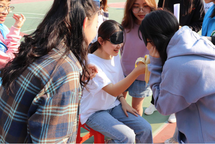 游戏在同学们期待的眼神中拉开了序幕,“游戏开始”一声令下,同学们便开始朝着各个任务点奔去。最令人捧腹大笑的就是“蒙眼吃水果”游戏了。参赛队伍需要派出三名同学,二人蒙眼,其中一位蒙眼的队员背着睁眼的队员前行至另一位蒙眼的队员面前,由睁眼的队员指挥蒙眼的队员吃香蕉。伴随着睁着眼睛的队员的指挥声,有的队伍把香蕉送到了鼻尖,有的队伍喂给了侧脸,有的队伍不到一分钟便完成了任务——一个香蕉三口入腹,现场气氛甚是欢乐。游戏的互动让省内外同学之间多了一份默契,进一步地了解彼此,增强了彼此之间的沟通力与表达力,同时也给同学们在烦闷的周末增添了趣味。
