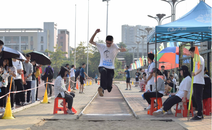 在跳远的赛场上,我院的跳远参赛者看准基线奋力一跃,落地的瞬间,沙子四溅,站在一边观看比赛的同学不禁为之喝彩,鼓掌叫好。