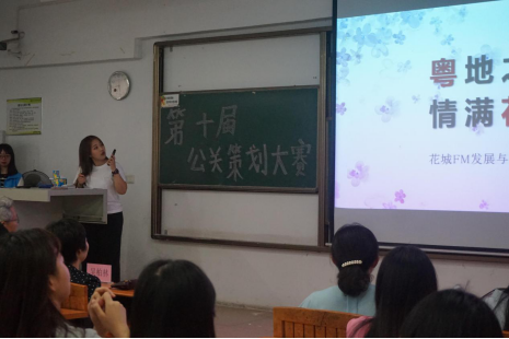 随后,第九届公关策划大赛获奖团队队长李思瑶同学上台向同学们展示了上一届大赛一等奖作品“花城FM策划案”,从项目背景、项目契机、项目调研、调研结论、项目策划、项目执行、效果评估、项目总结这几个方面向同学们分享她的参赛经验。