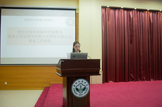 大会第一项,学生会常务副秘书钟菁湉宣读广州新华学院304am永利集团第一次学生代表大会筹备工作报告,全面汇报了大会筹备工作的流程和成果。