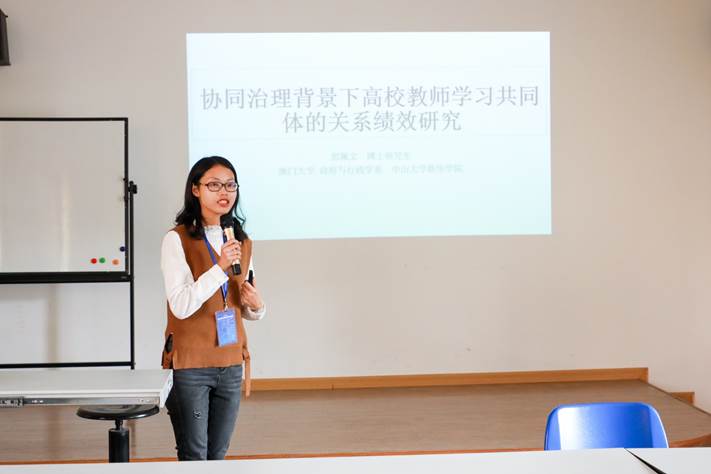 澳门大学博士研究生郭佩文以“协同治理背景下高校教师学习共同体的关系绩效研究”为主题,从“如何通过绩效管理提高高校教师的人力资本转化为组织资本的效率,不同场景的教师学习共同体社会网络是如何形成的,如何构建知识分享型高校教师学习共同体”这三个问题出发,结合高校教师学习共同体的概念,选取广东G学院的教师学习共同体为分析个案,以社会网络分析的理论与方法进一步分析关系绩效的影响因素在教师学习共同体社会网络中的作用机制。
