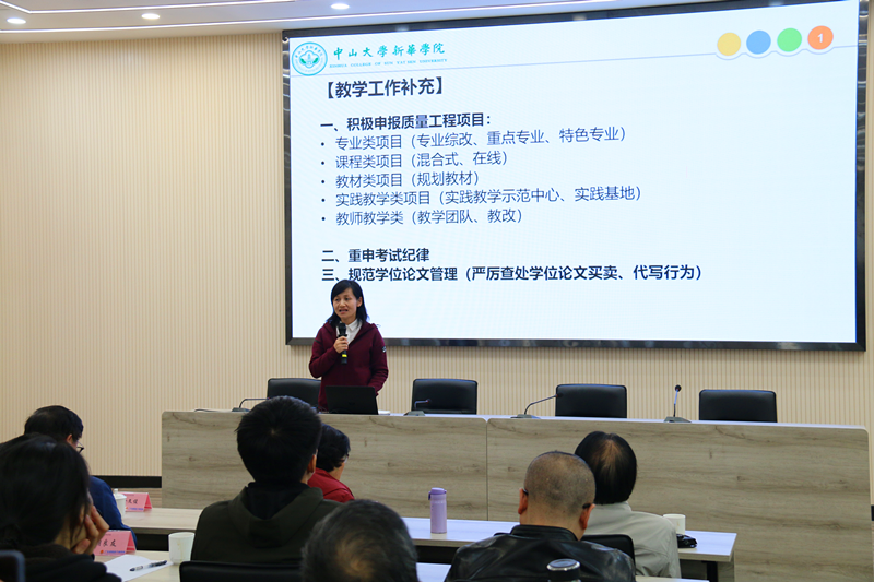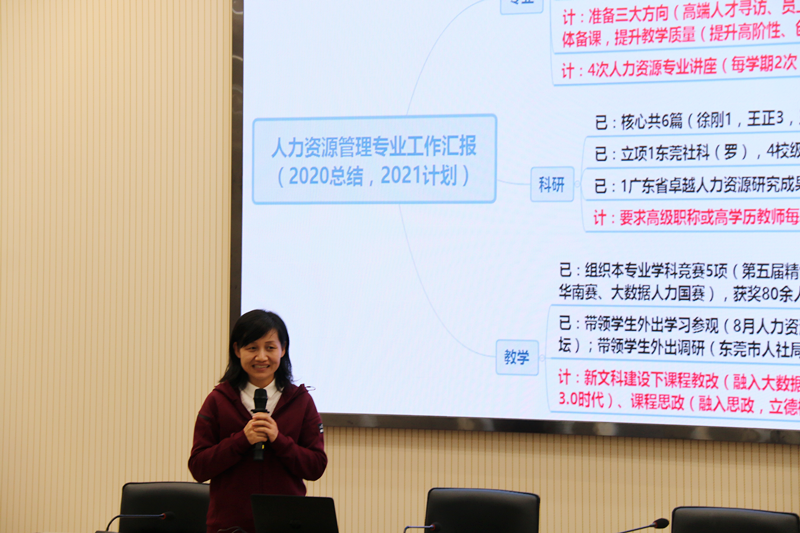 紧接着,五个专业负责人针对本年度的工作进行总结汇报。行政管理学科带头人张紧跟首先围绕教学、科研、品牌项目和教师获奖情况这四个方面展示本年度工作的开展情况及工作亮点(发表论文11篇,其中核心论文5篇、获得项目立项6项,总经费63.5万元)。公共关系学专业主任吴柏林重点围绕师资队伍建设、教学评估、科研工作推进情况等方面进行了总结发言。随后,罗亮梅副院长从专业建设、科研情况、教学开展三个方面进行了对人力资源管理专业的情况进行了总结发言。传播学学科带头人聂静虹从教学、科研、师资队伍建设等方面对本年度重点工作的推进情况作了汇报。社会工作专业主任助理饶新龙围绕教师队伍建设、科研项目开展情况、论文发表情况、参与学术活动活动、教学与专业建设情况、学生培养工作六个方面展示了社会工作专业工作亮点。
