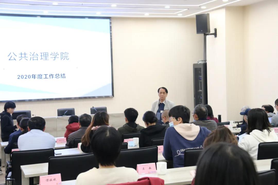 12月26日下午的总结会议分为三个部分,首先由徐文俊院长对我院本年度主要工作进行了总结。徐院长首先回顾了我院在2020年度完成的几项重要工作:一是学生获奖情况屡屡创优(第五届全国大学生人力资源管理知识技能竞赛(踏瑞杯)全国总决赛获特等奖、第一届“精创教育杯”HRD社团人力资源管理技能挑战赛总决赛特等奖、首届(2020年)全国高校公共管理与财政学决策”大赛获全国总决赛二等奖);二是科研项目、发表论文、产学研工作稳中有进。本年度我院申报科研项目26项(成功立项10项、10项未出立项结果)、申报校级教学质量与教学改革工程项目7项、申报“课程思政”校级示范课改革试点项目5项、申报校级学科竞赛5项,发表论文47篇(其中核心论文14篇)、高等教育教学成果奖1项、广东省卓越人力资源研究成果奖1项、获评2019年度科研先进单位。三是根据学校“48字线上教学思路”探索教育改革新模式,多措并举建立线上教学质量保障体系,落实推进“双进课堂”,监控教学质量,疫情期间线上教学效果良好;四是专业建设和师资队伍建设。顺利通过了行政管理和公共关系学的专业评估工作、申报新增一个应急管理专业、引进专职教师12名(高级职称教师6名、博士学位教师5名、海归教师1名)、聘请社会工作专业校外导师13名、范艳红老师的说课课程《行政管理学》、刘振夏老师的说课课程《人力资源招聘与配置》在第三届教师说课大赛总决赛中分别荣获一等奖和三等奖。我院获优秀组织奖。五是以转设为契机,不断加强办学规范和教学管理,强化质量文化,努力建金专、建金课,不断提升教学质量和水平。六是主办第四届地方政府与区域治理学术研讨会。