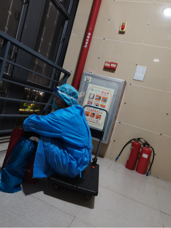 繁忙的工作也许终于要告一段落,回首前期,我们没有拍到什么照片,仅有一张,在7栋送纸巾休息的时候,曾皖湘老师坐在小拖车上望着灯光璀璨的华阳湖笑着说,外面看起来好像一切如常,只是太安静了。