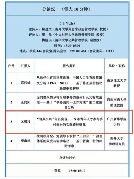 各个分论坛围绕地方政府组织与行为、数字化转型与区域治理、现代都市圈治理经验与理论、基层治理与城市创新、环境跨域治理和政策创新、全球城市群治理比较、相邻区治理、科技创新中的区域合作、区域协调发展中的府际关系以及区域治理研究的回顾与展望等议题展开了深入的讨论与交流,每个分论坛的评议人做了细致、全面和精彩的点评与讨论。我院区展玲老师在第一分论坛作了《“筑巢引凤”何以实现——S市青年人才参与乡村振兴的实践路径研究》的分享。