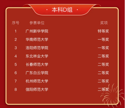 我院学子在比赛中与华南师范大学、杭州师范大学、长春师范大学等高校同一小组,冷静沉着地在比赛中展现了卓越的专业技能和团队协作能力,荣获初赛特等奖的好成绩,并成功晋级决赛。