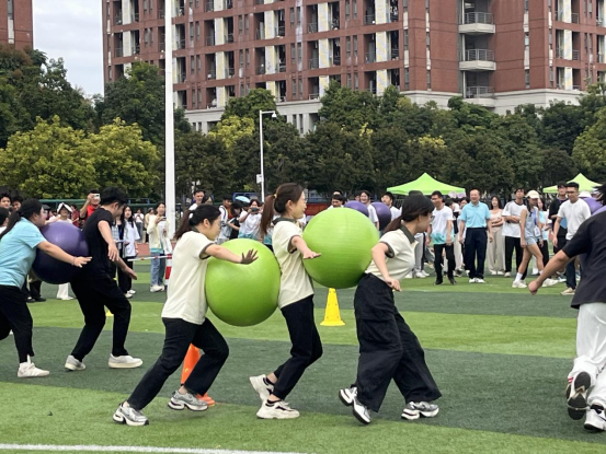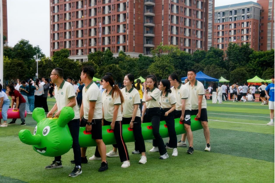 在趣味运动会中,老师们同样展现出了非凡的团队合作与竞技精神。他们参与了各种趣味横生的比赛项目,如袋鼠跳、三人两球、毛毛虫竞速、指压板大比拼等,这些项目不仅考验了他们的体能,更考验了教师们的团队协作能力。