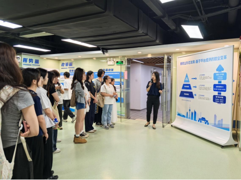 在林海莹经理的带领下,同学们参观了“新业者之家”的场地设施,深入了解“新业态”的历史长廊、党建引领区、职业指导室、争议调解室、劳动仲裁庭等功能区域。新业者之家”是佛山市禅城区在新业态权益保障方面的创新性举措,集党建工作引领、劳动权益保障、就业创业指导、矛盾纠纷调解、职业发展充电、生活关爱服务六大功能为一体的综合性平台。