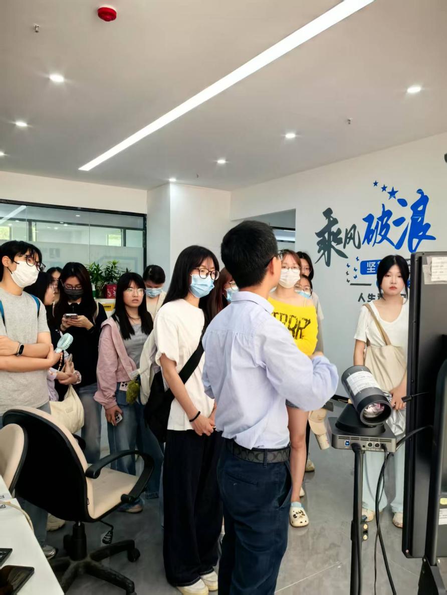 然后,在领航直播培训基地,师生深入直播间,零距离观察直播全流程设备与数据运营系统。通过“现场观摩+体验”学生切身感知直播行业对内容策划、品牌传播、新媒体运营等核心能力的需求升级。