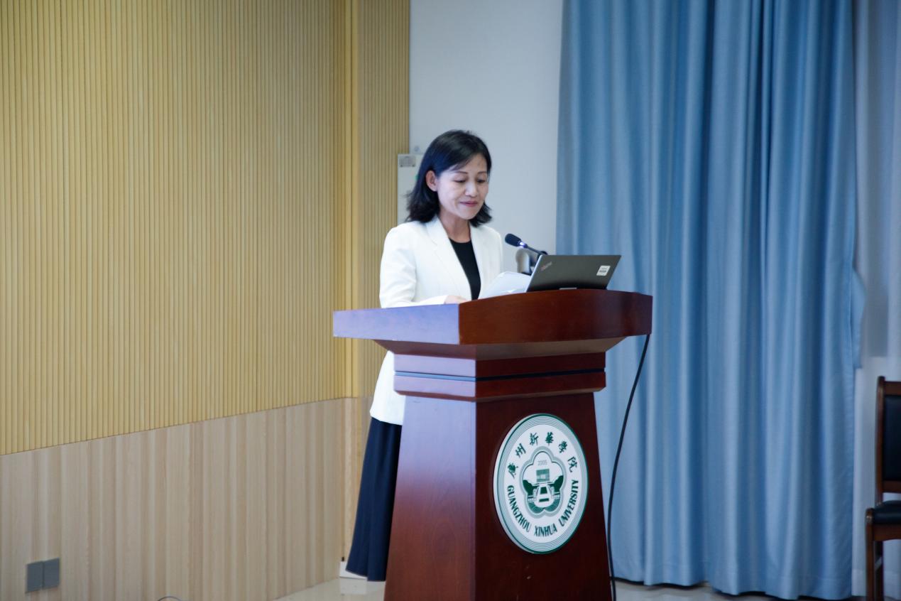 (图1:广州新华学院304am永利集团副院长罗亮梅主持开幕式,代校长宣读致辞)