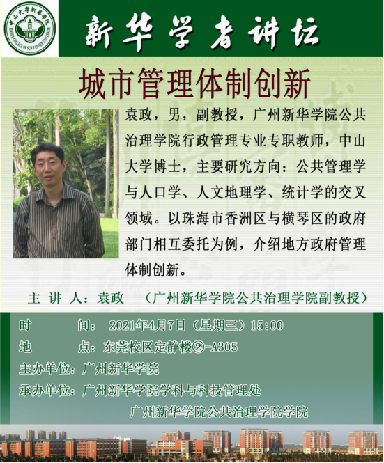 为开拓师生学术视野,加强行政管理学科建设,2021年4月7日下午,我院行政管理专业教师,中山大学袁政副教授给师生做了“城市管理体制创新——邻近区域政府职能部门间的新型委托考察”专题讲座。