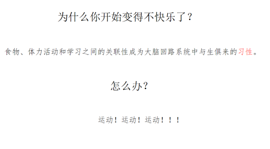 随后,他根据研究提出增加正性刺激的必要性,指出“食物、体力活动和学习”在几千年的发展中已经成为人类大脑回路系统中与生俱来的习性,他建议同学们可以从这三方面入手让自己“快乐起来”,特别是运动,长期坚持运动不仅能锻炼强健的体魄,更可以锻炼坚韧的性格,让人在遭遇挫折时不会轻易倒下,百折不挠,终会成功。