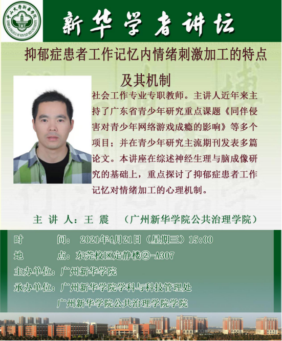 开拓师生学术视野,加强学科建设,2021年4月21日下午,我院社会工作专业教师王震博士,给师生做了“抑郁症患者工作记忆内情绪刺激加工的特点及其机制 ”专题讲座。