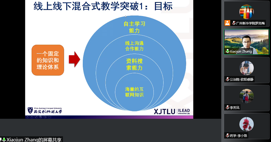 讲座期间,张晓军分享了为什么要做教学创新,通过教学创新的钻石模式,介绍了面向未来的10个教学创新方向,在未来视野下提出了能力和素养的操作化定义。给我们带来了其他高校的教学创新方法和理念的相关案例,涉及了农工医文史多个领域,剖析了线上线下混合式教学突破的内涵和核心,基于理论上的创新,给一线的教师带来了很多的灵感。