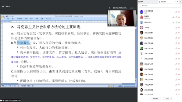 万教授从马克思主义的方法论和社会科学研究的具体方法、社会研究方法与实践、问卷调查的实施技巧四个方面展开本次讲座。他指出,马克思主义的基本观点是以人类社会的进步和发展为价值目标,我们做研究要一切从实际出发,从经验事实出发,进入理论的分析、抽象和概括,由感性认识到理性认识,由理性认识到实践应用,再由实践到理论,要注重逻辑分析、数学分析,学会在实践中应用和检验,要进行理论概括、反思和批判。