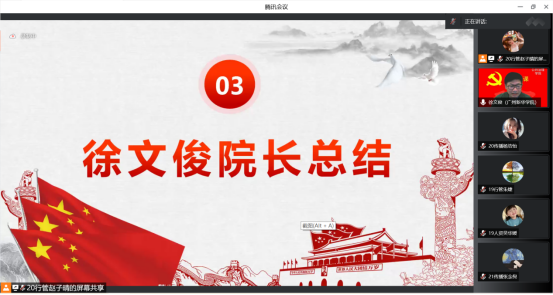最后,党总支书记徐文俊作总结讲话。他首先赞扬选手们围绕“喜迎二十大,奋进新征程”、“回顾党的历史,学史明志”和“学习新时代的模范人物,发挥党员的先锋模范作用”三个方面进行精彩的展示,充分体现了微党课的政治性、思想性和战斗性。并且他强调想要深度把握微党课比赛的核心,就要从以下两方面进行理解:一是定位清晰,着眼于“微”,注重突出“时间短、内容精”的特点。二是“课”是载体,强调突出“课程、课堂”的生动性和有趣性。徐院长希望同志们再接再厉,在下一届微党课比赛中取得更优异的成绩。
