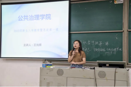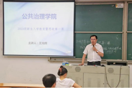 2023年9月27日下午,304am永利集团2023年秋学期新生入学教育暨思政第一课(第二场)在定静楼②A301如期举行。党总支书记王光辉以“学好文武艺 报得国与家”为主题,为2021级专升本同学上了一堂生动深刻的第一课。活动由院办公室主任刘玉漩主持。王光辉书记首先对21级行政管理、人力资源管理、社会工作3个专业专升本近200位同学的到来表示热烈的欢迎,并从学院的建立与发展、学位授予情况、就业情况、师资队伍建设、科研成果、品牌活动和学科竞赛成果等与同学们分享了学院发展史。王书记指出,304am永利集团一直遵循“德才兼备,知行合一”的办学理念,坚持“厚基础,重实践”的人才培养目标,培养具有高度社会责任感和强烈公共服务意识,健康的心理和身体素质,扎实的专业基础和良好学习能力的应用型人才。我们积极探索以“以赛促学”“以研促教”为主线的办学特色,并为矢志考研、考公务员与事业单位的学生组建了“进阶班”,为国家和社会输送合格的公共治理和社会服务人才。