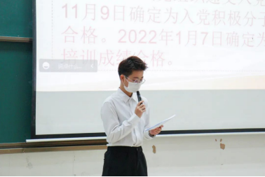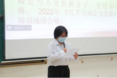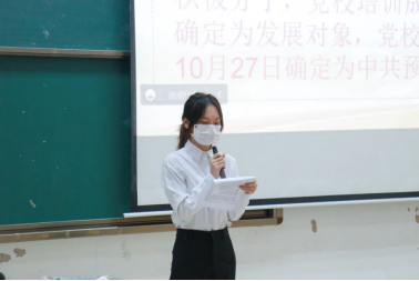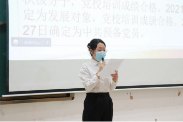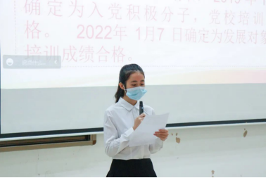 发展对象刘艳珊等9位同志依次上台做汇报发言,汇报其自身在考察期中思想、学习、工作以及生活方面的感悟、收获等情况,并表明自己已经做好接受党组织考察的准备和决心。