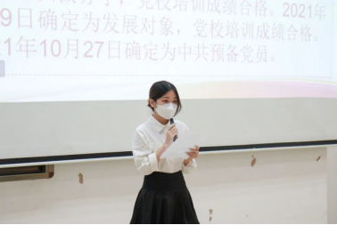预备党员黎慧怡等7位同志依次上台做汇报发言,汇报其自身在考察期中思想、学习、工作以及生活方面的感悟、收获等情况,并表明自己已经做好正式成为一名合格党员的准备和决心。