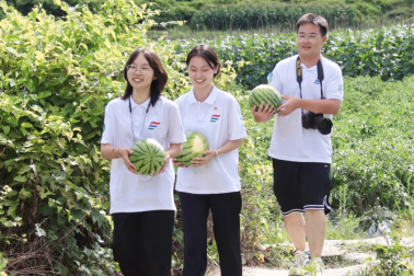 (图 2 为蔡丽华同学下乡助农,协助农民搬运西瓜 左二)