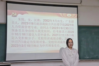 按照党组织预备党员转正工作规范程序,预备党员朱悦等6位同志依次上台作汇报发言,汇报其自身在预备期的思想、学习、工作以及生活方面的感悟、收获等情况,并表明自己已经做好成为一名合格正式党员的准备和决心。