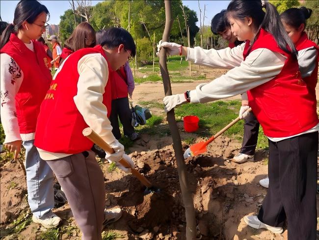 活动开始,我院师生志愿者分工协作,经过铲土、挖坑、扶苗、填坑、浇灌、挂牌等环节,稳稳栽下了树苗,为初春的新华校园注入绿色活力。