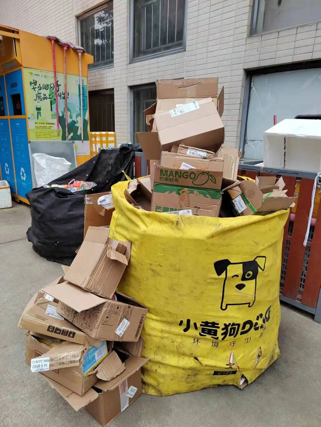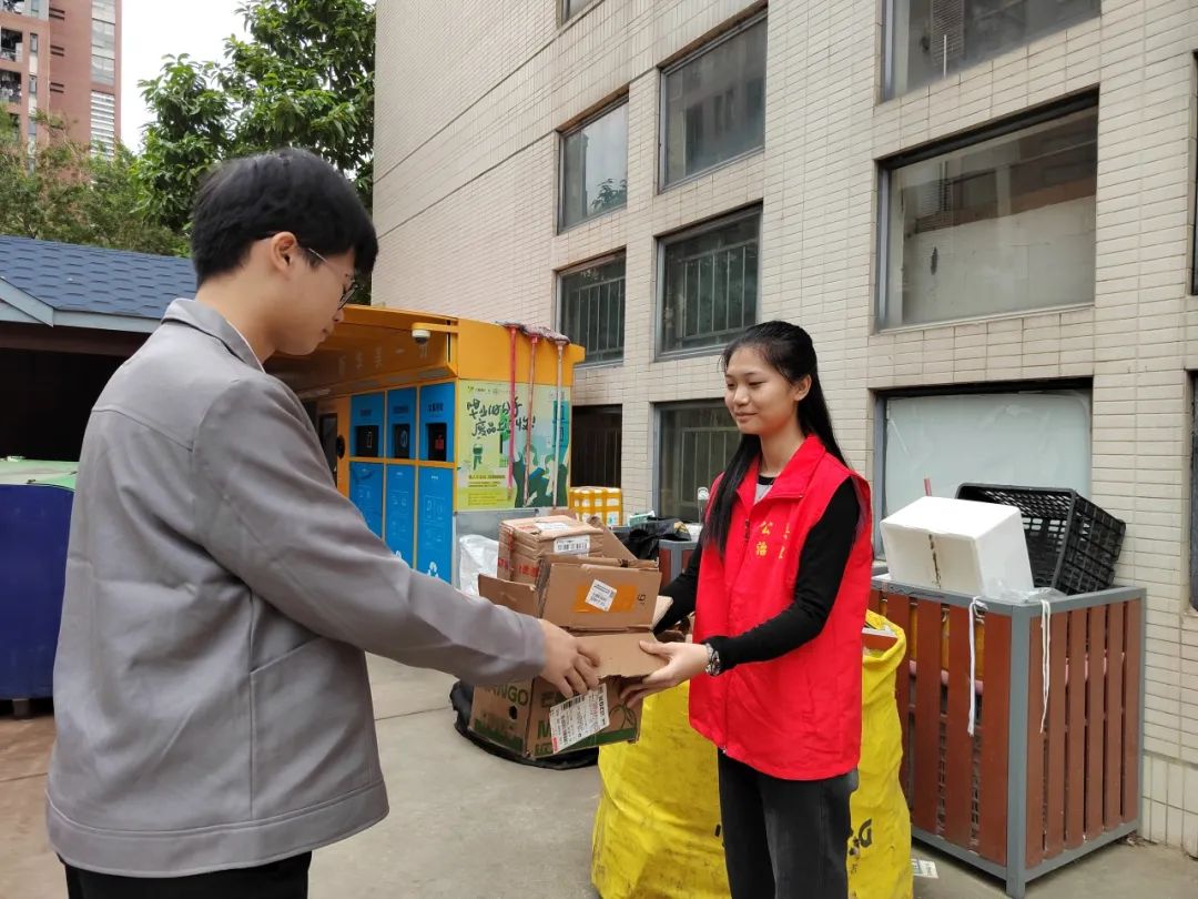 活动过程中,志愿者们坚守岗位,将可回收的瓶子、废纸盒打包进了事先准备好的袋子里面,并对快递盒进行分类整理,让它们发挥出更大的价值。在收集过程中,他们还向同学们宣传环保知识,鼓励大家一起参与到废品回收的活动中来。