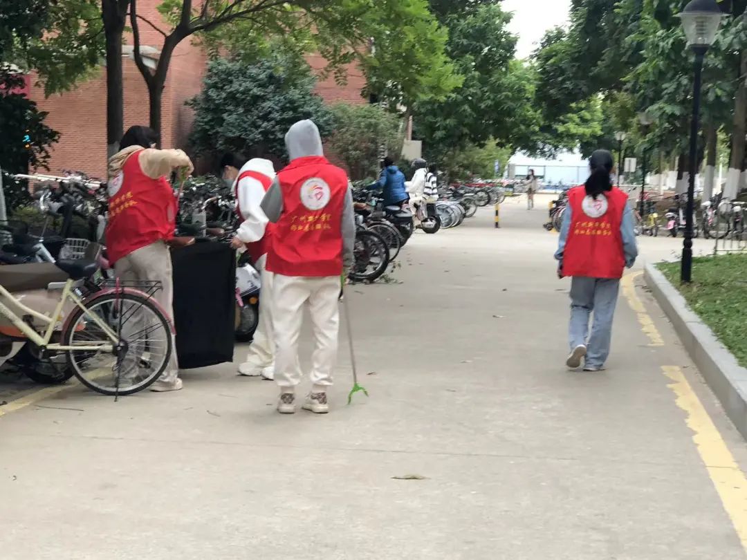 志愿者们用自身行动诠释“志愿精神”,他们或俯身拾捡垃圾,或用扫把清洁地面,或团结协作将自行车摆放整齐,为我们共同生活的校园环境抹上整洁舒适的色彩。