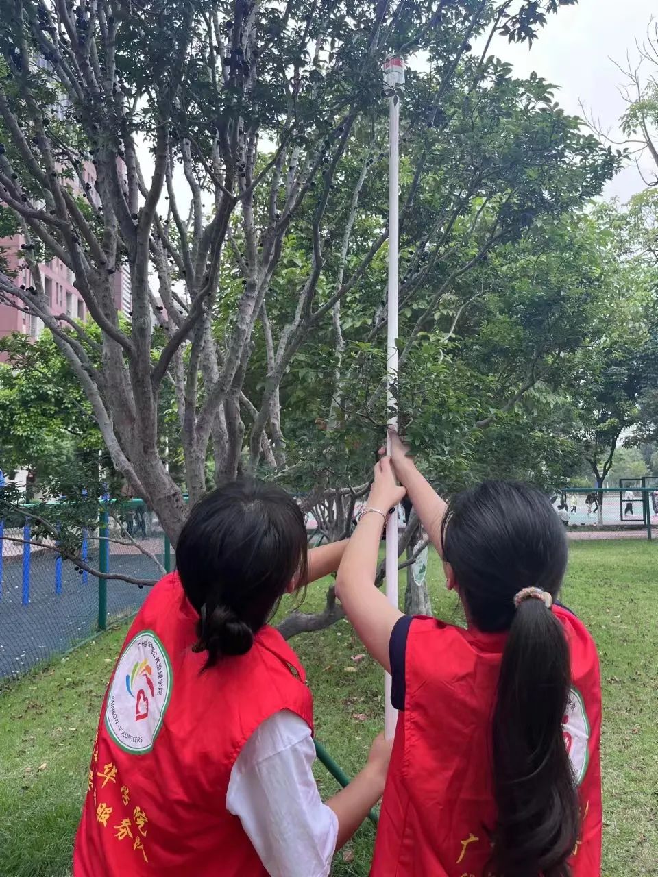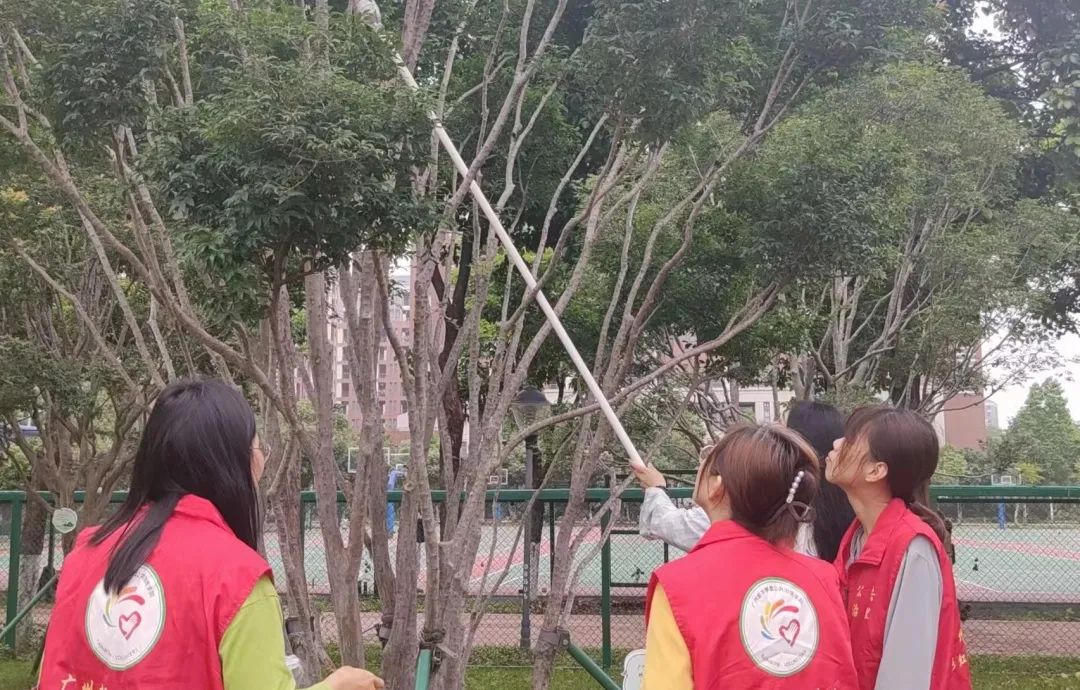 挂牌仪式后,看着这满树的果实,师生志愿者们都纷纷拿起长柄工具尝试采摘。一抬脚,一举杆,嘉宝果一颗颗准确落入采摘器中。志愿者们环绕在树下,仰头左右观望,比对哪颗果实个头最大。这份收获的喜悦感洋溢在每一位志愿者脸上的笑容。