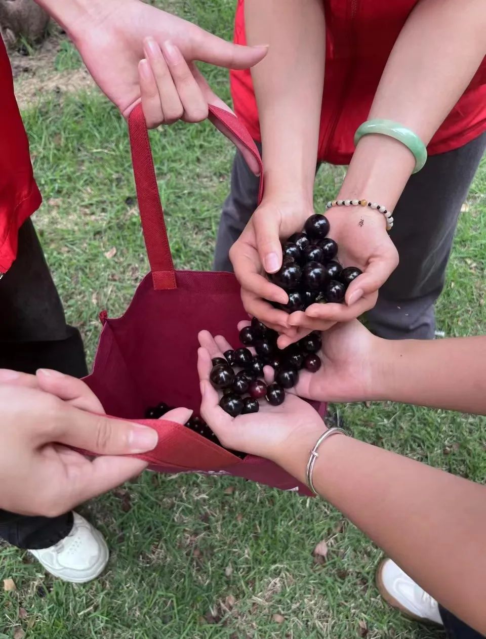 活动结束后,志愿者们共同品尝他们的劳动果实,亲身采摘的体验感为果实更增添了一份鲜甜。树梢上一串串乌黑亮丽的嘉宝果,更把路过的同学们吸引过来,志愿者也十分热情地分享给同学品尝,这份丰收的喜悦将传遍美丽的新华校园。